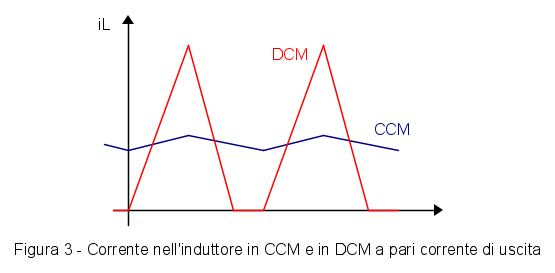 I convertitori a commutazione possono essere progettati per funzionare in modo continuo, CCM, in cui la corrente dell'induttore non va mai a zero e in modo discontinuo, DCM, in cui la corrente va a zero alla fine di ogni ciclo, come mostrato in Fig. 3.