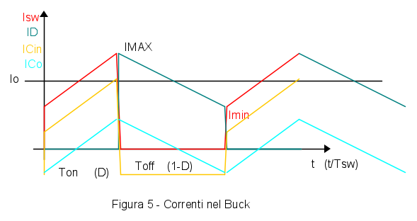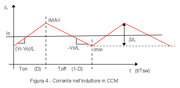 In Fig. 4 è rappresentata la corrente di induttore di un Buck in modo continuo, con la pendenza delle rampe di salita e discesa. La corrente di uscita