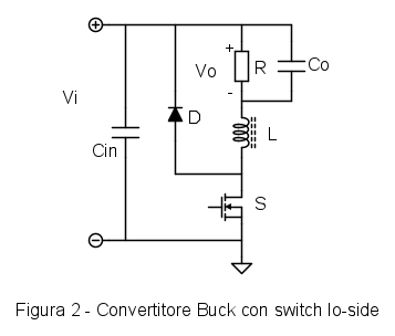 In questa applicazione il controllo viene fatto misurando la temperatura del sistema, che risponde con costanti di tempo enormemente più lunghe rispetto al periodo di commutazione, mentre non è richiesto avere una retroazione dalla tensione di uscita. Questo permette di modificare il circuito portando l'interruttore in posizione lo-side, come mostrato in Fig. 2.
