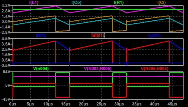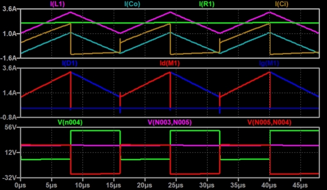 e si vede essere continua, in verde la corrente di uscita che è il valor medio della corrente dell'induttore. In azzurro è rappresentata la corrente nel condensatore di uscita, uguale a quella dell'induttore meno il suo valor medio. La corrente in giallo è la corrente nel condensatore di ingresso, uguale a quella dell'interruttore meno il suo valor medio.