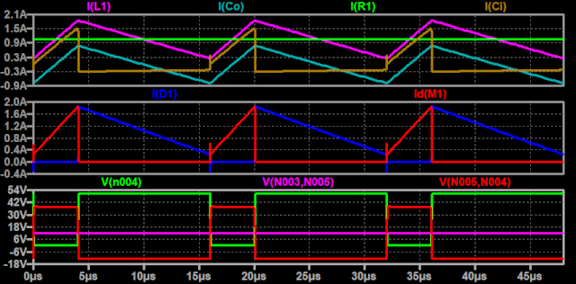 Nel secondo grafico si ha in rosso la corrente nell'interruttore, e in blu quella nel diodo. Queste due correnti, sommate, danno la corrente nell'induttanza.