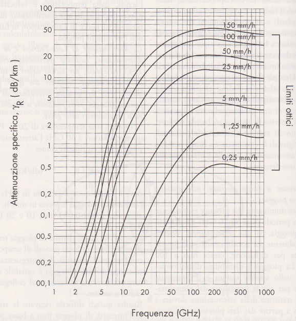dove f è la frequenza espressa in GHz ed R l'intensità di pioggia espressa in mm/h. Il coefficiente K vale all'incirca 0,002-0,003 tra i 10 e 20 GHz e 0,006 a 30 GHz.