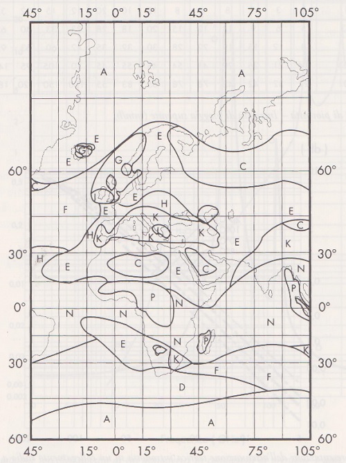 Risulta pertanto difficile ricavare la statistica dell'intensità di pioggia fino a basse percentuali dalle pubblicazioni dei servizi meteorologici. In mancanza di dati locali più precisi, l'intensità di pioggia R può essere ricavata da una mappa definita dall'ITU-T riportata di seguito: