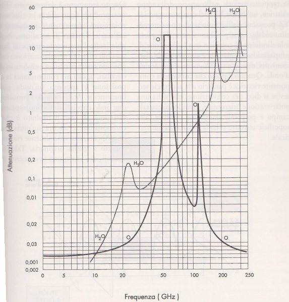 - Ossigeno - Le molecole biatomiche O2 hanno movimento magnetico per cui, interagendo con la radiazione e.m., per determinate frequenze, si hanno delle transizioni tra stati quantici che provocano picchi di assorbimento per tali frequenze. La seguente figura riporta l'attenuazione specifica dovuta ai gas atmosferici; si può osservare che sono presenti più righe di assorbimento molto vicine tra loro, tra 50 e 70 GHz ed una riga di assorbimento che si presenta a 118,74 GHz: