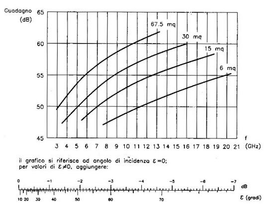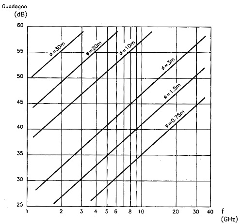 Le antenne paraboliche impiegate nei ponti radio a microonde presentano una gamma di valori che va da 25 dB per antenne con diametro di 1,5 m a 1500 MHz, fino a 60 dB per le grandi antenne (diametro di 30 m) per i ponti radio satellitari, come si può evincere dal seguente diagramma: