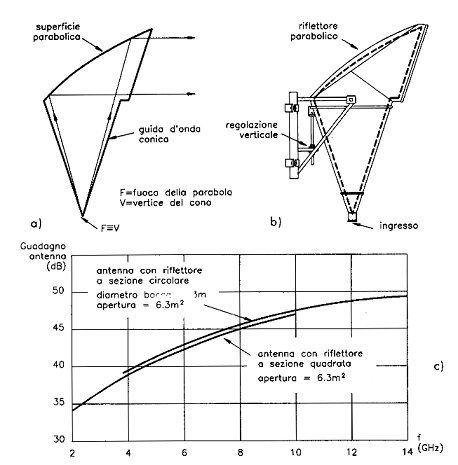La porzione di parabola che viene vista dal fuoco può essere quadrata o circolare. Di conseguenza, la tromba che prolunga l'illuminatore sarà rispettivamente un tronco di piramide oppure un tronco di cono. Questa tromba è metallicamente connessa con lo spicchio parabolico e tale disposizione riduce notevolmente le irradiazioni spurie nelle direzioni posteriore e laterale, come possiamo osservare nella precedente figura al punto b).