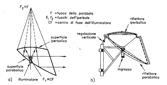 Si differenzia dall'antenna a paraboloide di rivoluzione precedentemente esaminata (e di cui è un caso particolare) in quanto è caratterizzata dalla presenza di una seconda superficie riflettente di tipo iperbolico: