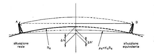 Nella progettazione della tratta radio, si ricorre comunque all'espediente di considerare rettilinei i fasci radio, attribuendo alla curvatura terrestre un valore equivalente nel quale è compendiato l'effetto della curvatura dei raggi per effetto della rifrazione. In altre parole, il tragitto dei raggi e.m. può venir considerato rettilineo, a patto che si assuma per la curvatura terrestre un raggio detto equivalente Req che deve soddisfare ad alcune condizioni, come si evince dalla seguente schematizzazione: