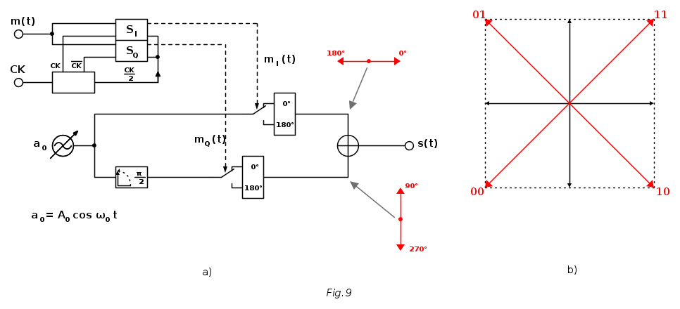 Infine, dopo la modulazione 2PSK, le due sottoportanti entrano in un circuito sommatore che ne esegue la somma vettoriale. E' immediato osservare che il vettore somma potrà assumere una fra quattro possibili posizioni di fase (si faccia riferimento al diagramma vettoriale di Fig.9b)), a cui corrisponde una combinazione univoca del dibit presente sui moltiplicatori.