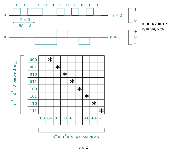 - Facciamo un esempio. Supponiamo che il codificatore di linea alfabetico, con sequenza binaria am in ingresso, operi la codifica considerando blocchi di Z = 3 bit (m = 2) fornendo in uscita blocchi di W = 2 impulsi a 3 livelli (n = 3, ovvero 0, + e − ). Si avrà pertanto la corrispondenza fra le nW = 32 = 9 possibili parole della sequenza an codificata con le mZ = 23 = 8 possibili parole della sequenza am da codificare. La schematizzazione dell'esempio è di seguito mostrata: