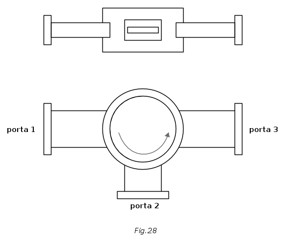 e indica la successione delle porte adiacenti nel senso di minore attenuazione. Osserviamo che un segnale entrante dalla porta 2 trova minima attenuazione procedendo nel senso della freccia ed esce dalla porta 3 attenuato di pochi decimi di decibel. Lo stesso segnale, misurato sulla porta 1, presenterà un'attenuazione molto elevata. Analogamente si comportano i segnali posti all'ingresso delle porte 2 e 3.