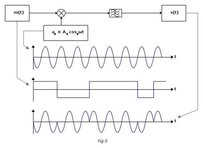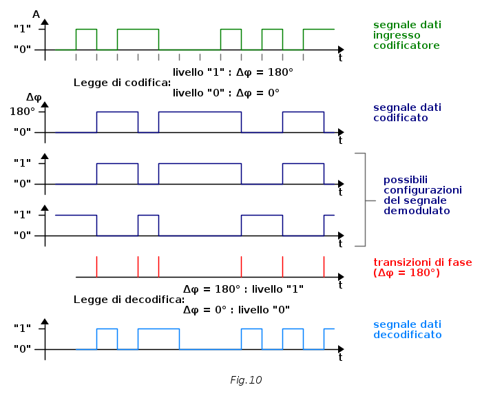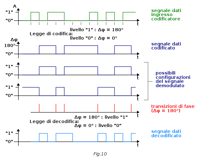 Il risultato del prodotto fornisce quindi una portante in cui ad ogni transizione del segnale dati, la fase della portante si rovescia istantaneamente.