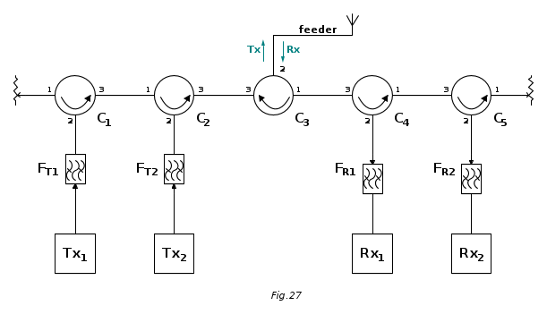 Si comprende che la catena di coppie circolatore-filtro di canale si può estendere indefinitamente, con l'avvertenza che l'attenuazione di percorso cresce all'aumentare del numero di circolatori interposti tra l'ultimo della serie e quello centrale (detto circolatore d'antenna).