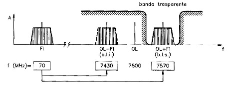 ), sia la frequenza dell'OL che, avendo esaurito la sua funzione, non deve essere trasmessa dal trasmettitore (per ovvi motivi di inutile dispendio energetico). Notiamo inoltre che nulla cambierebbe qualora si decidesse di adottare la banda laterale inferiore, eliminando quella superiore. Si comprende che scegliendo opportunamente la fOL e di conseguenza il relativo filtraggio, è possibile traslare lo spettro del segnale a FI in qualunque frequenza della gamma a RF.