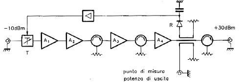 ) è ottenuto con quattro stadi attivi a GaAs, separati da isolatori in ferrite. All'uscita dell'ultimo stadio, un doppio accoppiatore direzionale provvede a fornire un punto di misura per il controllo della potenza d'uscita, nonché una tensione rivelata che controlla un attenuatore a diodo PIN presente all'ingresso del primo stadio. Con ciò si realizza un circuito AGC (Automatic Gain Control), che permette di mantenere costante la potenza d'uscita, garantendo peraltro il necessario back-off in qualunque condizione operativa.