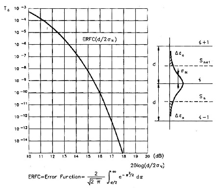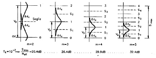 Nel punto di decisione il segnale si presenta non più attenuato, grazie all'azione dell'amplificatore-equalizzatore, ma ancora distorto ed inquinato da rumore. Osserviamo che il riconoscimento errato avviene soprattutto a causa dei picchi di rumore che fanno riconoscere, negli istanti prefissati, il livello sbagliato; appare allora evidente che il fattore determinante sulla qualità di una trasmissione di segnali discreti non è tanto la distorsione introdotta sulla forma del segnale in ricezione, quanto la potenza del rumore disturbante. In altri termini, più alta sarà la potenza media del rumore, maggiore sarà la probabilità che picchi di rumore provochino un errato riconoscimento. Di seguito è illustrata la relazione tra il tasso d'errore e il rapporto segnale/rumore (in funzione del numero m di livelli) che esplica quanto appena esposto: