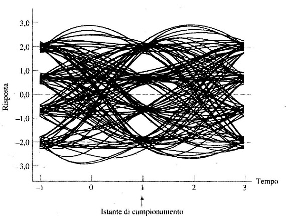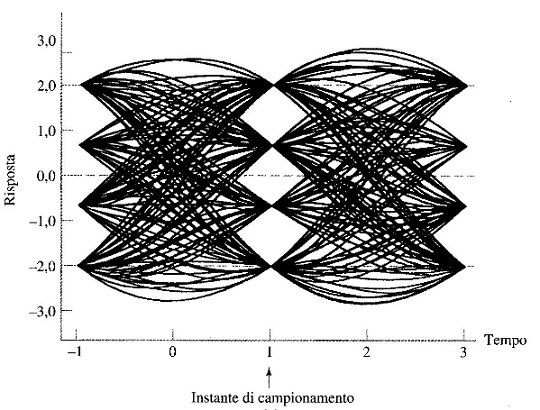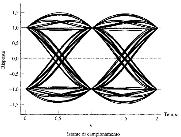 - Istante ottimale di campionamento. La larghezza dell'apertura dell'occhio definisce l'intervallo di tempo nel quale la forma d'onda binaria distorta che compare all'uscita del filtro di ricezione, può essere campionata uniformemente senza commettere errori di decisione. Chiaramente, l'istante ottimale di campionamento è l'istante in cui l'apertura dell'occhio è massima;