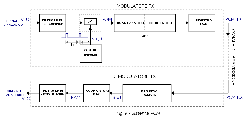Vediamo quindi come è realizzato lo schema a blocchi del modulatore-demodulatore PCM: