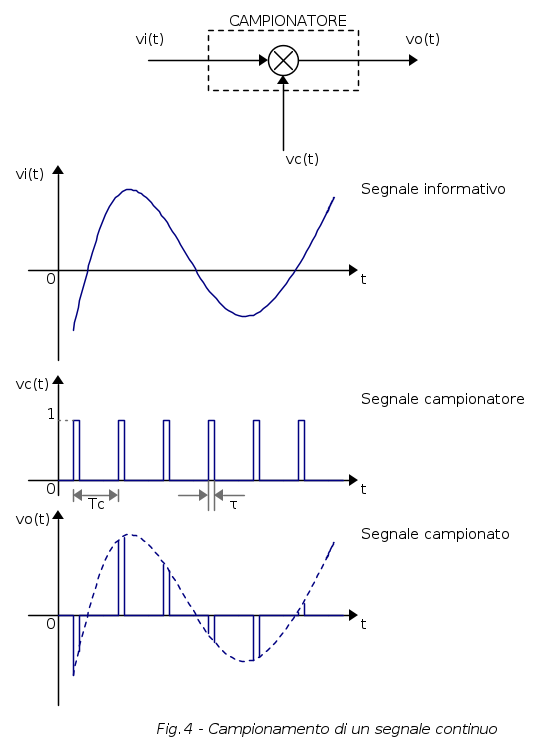 Il campionatore è schematizzabile come un interruttore elettronico comandato dal treno di impulsi fornito da un generatore di segnali; il funzionamento è elementare: nell'intervallo di tempo τ in cui l'interruttore è chiuso il segnale di uscita è vo(t) = vi(t), mentre quando l'interruttore è aperto risulta vo(t) = 0. Inoltre, per un corretto funzionamento del circuito, il segnale di campionamento deve rispettare le seguenti esigenze: