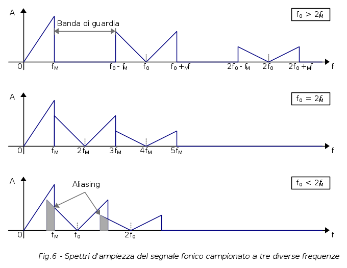 Nel caso di segnale fonico con spettro in frequenza del tipo illustrato in Fig.3, lo spettro del segnale campionato a frequenza fc sarà come la seguente figura, dove sono rappresentate le tre possibili condizioni di sovracampionamento (ponderato, vedremo successivamente perché), campionamento minimo e sottocampionamento:
