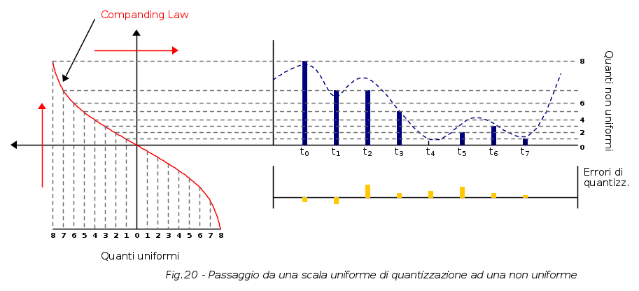 In sostanza si vuole arrivare al concetto di quantizzazione non lineare con la quale i gradini di quantizzazione non sono più uniformi ma via via si allargano all'aumentare dell'ampiezza del segnale; in tal modo si raggiunge il risultato di eguagliare praticamente il rapporto segnale/rumore in tutto l'arco della dinamica, dato che per segnali bassi sono interessati quanti ravvicinati e per segnali elevati quanti più distanziati, come si può vedere nella seguente figura: