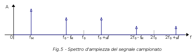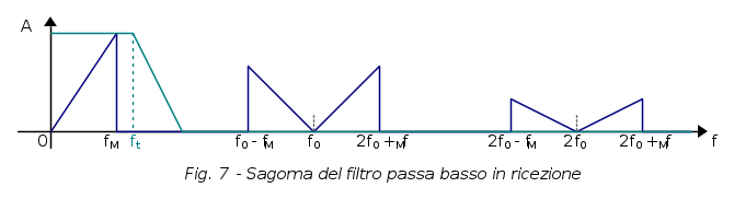 che è un pò la dimostrazione euristica del teorema di Shannon. Al ricevitore, per estrarre il segnale informativo è sufficiente inserire un filtro passa-basso la cui sagoma consenta di racchiudere per intero lo spettro del segnale originario in banda base, cioè progettandolo con una frequenza di taglio che sia maggiore della frequenza massima del segnale informativo: