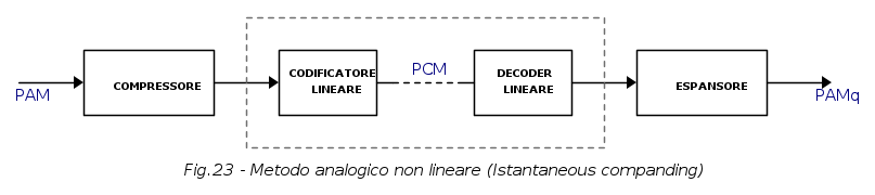 - metodo analogico - non lineare o di compressione istantanea con impiego di un compressore lato trasmissione e di un (duale) espansore lato ricezione, prima e dopo la co-decodifica;