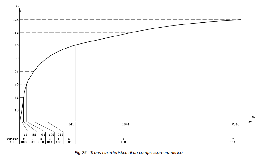 Nella tratta 3, con ABC = 011, dei 64 livelli di entrata Ni ne restituisce 16 e cosi via finché nell'ultima tratta, con ABC = 111, dei 1024 livelli di entrata, compresi tra 1024 e 2048, ne restituisce 16, compresi tra 112 e 128.
