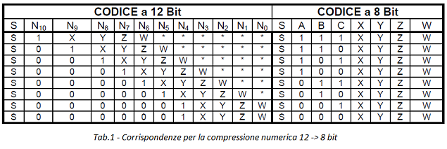Vediamo come si opera una compressione numerica; si è detto che tale dispositivo deve trasformare una parola binaria a 12 bit (4096 combinazioni) in una a 8 bit (256 combinazioni).