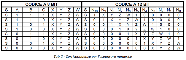 Possiamo vedere come nel passare dal codice a 8 bit a quello a 12 bit, si devono inserire dei bit aggiuntivi nelle posizioni di ordine inferiore, ad eccezione delle tratte ABC = 000 e ABC = 001 che presentano una codifica lineare.