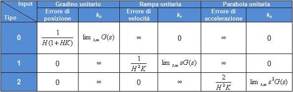 Supponendo un sistema con retroazione unitaria (H=1), sostituendo queste definizioni alle precedenti espressioni ricavate per gli errori statici otteniamo, relativamente ai tre ingressi canonici trattati (non unitari per considerare il caso più generale):
