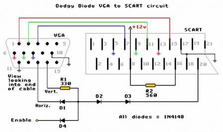 Veniamo ora ad uno dei primi schemi un po’ più “complessi” : in questo caso i collegamenti delle linee R,G,B e rispettive masse è sempre lo stesso del precedente (non fatevi ingannare dalla presa scart che in figura è ribaltata rispetto alla precedente, i numeri dei pin sono comunque sempre gli stessi); la differenza qui è l’utilizzo di una scheda video classica, ossia non in grado di generare un segnale composito (quindi tutte, Radeon a parte); i segnali di sincronia provenienti dai pin n.13 e 14 della VGA vengono miscelati da alcuni diodi 1N4148 (più una resistenza da 330 Ohm) e quindi inviati al solito pin 20 della scart; anche in questo caso il pin n.8 è connesso, come nello schema n.2b, all’alimentazione a 12v allo scopo di commutare l’apparecchio sul canale AV; il pin 16, invece, anziché prendere i 5v come visto in precedenza prende direttamente i 12v; il trucco sta nella resistenza, ora più grossa (da 560 Ohm) in grado di ridurre la tensione ai soliti 3v necessari per abilitare l’ingresso RGB sul televisore; il vantaggio di questa soluzione sta ovviamente nell’utilizzo di un’unica alimentazione (12v appunto) anziché 2 (12 e 5v). Altra piccola differenza sono le masse sui pin. 17 e 18, usate solitamente dal solo segnale composito e quindi presumibilmente non indispensabili; dato che comunque una massa in più male non fa, se intendete usare questo schema nel dubbio collegatele; discorso simile per il pin n.11, che collegato a massa avvisa la scheda video della presenza di un monitor a colori (essendo oggi lo standard spesso tale pin viene posto a massa già all’interno del cavo VGA). Notiamo infine un segnale cosiddetto di “enable”: lo scopo è di abilitare il segnale di sincronia solo quando questo è effettivamente a 15khz (cosa che per es. con soft15khz o Powerstrip avviene solo dopo l’avvio del sistema operativo); a tale scopo è necessario applicare una ulteriore tensione di 5v al cavo, magari usando un apposito interruttore. Se non si è interessati a questa funzione (per esempio perché si possiede una Arcadevga) si può eliminare il diodo D4 e utilizzare il resto del circuito.