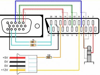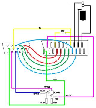 ATTENZIONE: Affinché lo schema funzioni è fondamentale che la scheda video sia in grado di mandare in uscita sul pin 13 un segnale in formato COMPOSITO, cosa che normalmente NON avviene; solo alcune schede video, appartenenti alla famiglia delle ATI RADEON, sarebbero in grado di fare ciò; tale funzione inoltre sembra debba essere attivata appositamente attraverso i driver Catalyst. Se la vostra scheda grafica non ha questa caratteristica dovrete quindi avvalervi di uno degli schemi che presentiamo più avanti.