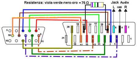 Sia nel cavo VGA che nella presa SCART sono presenti parecchie masse, spesso già collegate tra loro all’interno del cavo stesso; normalmente è buona norma collegarle tutte (soprattutto le 3 relative alle linee RGB) al fine di ridurre al minimo i possibili disturbi; stesso discorso vale anche per l’eventuale rivestimento interno del cavo (presente soprattutto nei cavi di buona qualità) che normalmente lo scherma anche dalle interferenze esterne. (N.B. la massa, per definizione, è sempre una sola: pertanto è normale che tutte le masse risultino, in quanto tali, sempre collegate tra loro.)