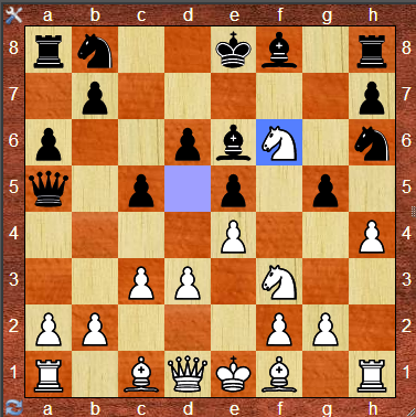 a seguito della mia difesa dallo scacco, è stato tentato un attacco al mio Cavallo spostando l'Alfiere campo bianco in e6, ed è ancora errore del buon franpomo: la Donna precedentemente mossa ha svincolato il pedone in f6 che ora risulta non protetto, e per me questo è un ottimo vantaggio numerico; inoltre do scacco al suo Re, scacco che vale molto più del suo: dare scacco con il Cavallo ha un valore aggiunto, in quanto non potendo interporre alcun pezzo data la particolarità del Cavallo, costringe il mio avversario a muovere il Re, e questo si traduce in impossibilità di arrocco futuro, con la conseguenza di avere un Re in posizione critica e nessuna delle due Torri che può intervenire nel gioco senza perdita esagerata di mosse.
