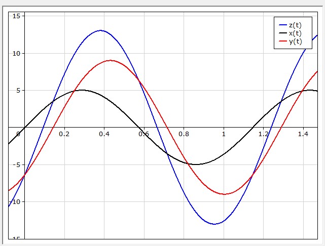 dapprima definiamo x(t) e y(t); in seguito indichiamo con z(t) la loro somma; e poi attraverso il comando Plot disegniamo sia gli addendi, che la somma: