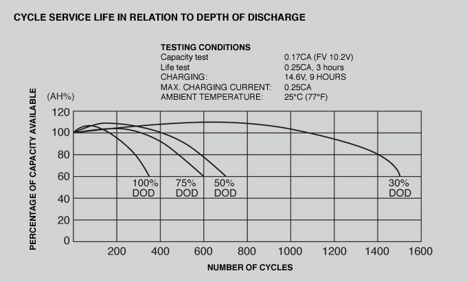 Ma per determinare la vita di queste batterie non ci si deve riferire agli anni di Garanzia indicati dal costruttore, ma al numero di clicli di CARICA e SCARICA che la batteria può fare nella sua vita utile. Inoltre, il numero di cicli dipende da quanto "profonda" è ciascuna la scarica.