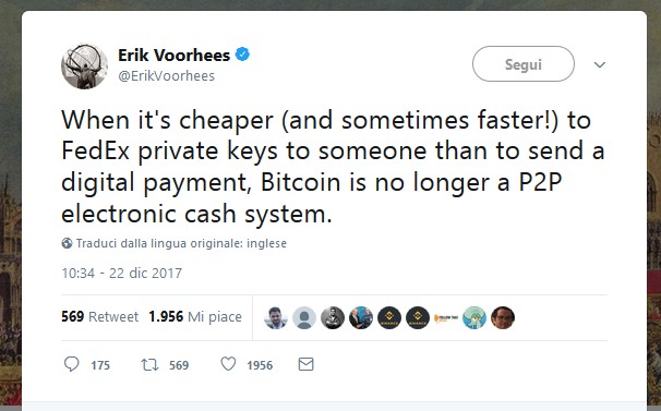 Lo ha sottolineato, in un post su Twitter, anche Erik Voorhees, amministratore delegato di Shapeshift, azienda Svizzera che si occupa dello scambio tra criptovalute, molto nota a livello mondiale.