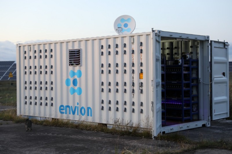 Sull'onda di questo entusiasmo per le criptovalute, si sono sviluppate aziende che ora forniscono chiavi in mano veri sistemi industriali preconfezionati per il mining, come ad esempio il Container della Envion, che potete vedere in questa immagine.