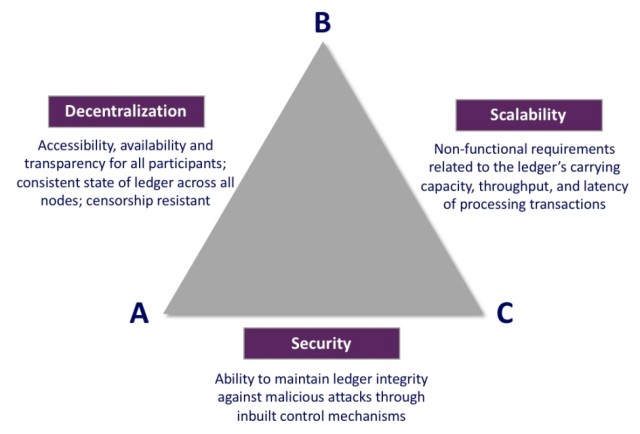 Bitcoin invece raggiunge le prime due ma non è scalabile, in quanto il protocollo non prevede la possibilità di aumentare il numero di operazioni al secondo (limitate dallo spazio concesso per inserire dentro ogni blocco).