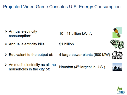 Stando ai dati pubblicati dall'associazione NRDC (Natural Resources Defense Council), nel 2014 negli Stati Uniti sono stati consumati circa 10 Terawattora solo per far funzionare le console che hanno in casa i cittadini americani.