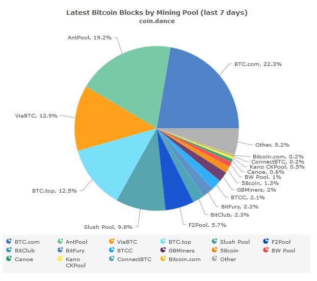 Come si può vedere dal grafico sottostante, che riguarda i blocchi confermati nella criptovaluta Bitcoin, è evidente che la maggior parte dei minatori lavora in pool; i valori percentuali si riferiscono a quanti blocchi ciascuna pool ha confermato nell'ultima settimana (settimana n. 2 del 2018).