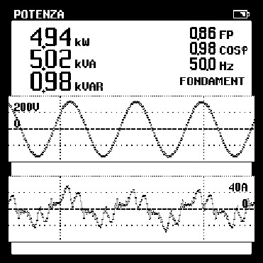 Anche in questo caso si può notare come la forma d'onda della corrente manifesti una elevata distorsione armonica, tanto che, nonostante il Cosfi sia 0,98, abbiamo un fattore di potenza di 0,86.