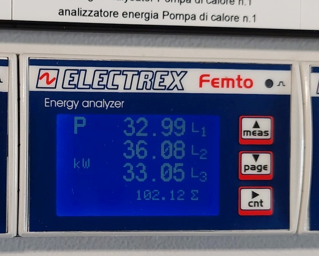 All'atto della misura l'assorbimento della centrale di pompaggio assorbiva complessivamente 15kW (circa 5 kW per fase), quindi meno del 40% della potenza nominale, a dimostrare l'azione di "modulazione" degli inverter.