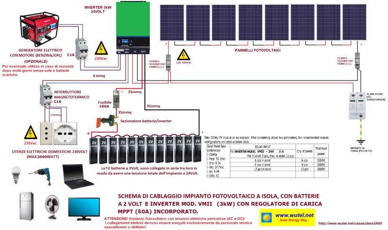 Attenzione che è necessario realizzare, nel quadro elettrico di casa, un sistema di commutazione con dei Relè, in modo da scollegare le utenze dalla classica alimentazione (che arriva dalla rete) e passarle alla alimentazione di riserva proveniente dall'uscita di Backup dell'inverter.
