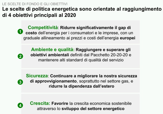 Un corposo documento di 116 pagine. E' il documento che detta le linee guida del nuovo Piano Energetico Nazionale, presentato Martedì 16 Ottobre dal Ministero dello Sviluppo Economico, dopo oltre 20 anni di attesa, abbracciando tutti i settori energetici, dall'elettricità al gas, dal petrolio all'efficienza energetica, dalle bollette troppo care alla razionalizzazioni delle reti.