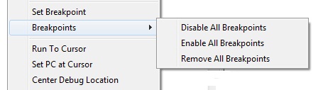 E’ anche possibile inserire dei breakpoint utilizzando il mouse. Posizionatosi sulla riga di interesse ed effettuando il doppio click si inserisce il breakpoint, rieffettuando il doppio click lo si elimina. Un altro metodo consiste nell'utilizzare il tasto destro del mouse e selezionare “Set Breakpoint”. In questo caso avremo la B su fondo rosso che ci indica la presenza del break.