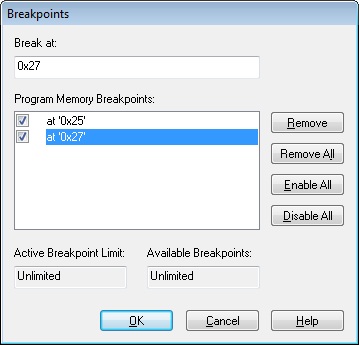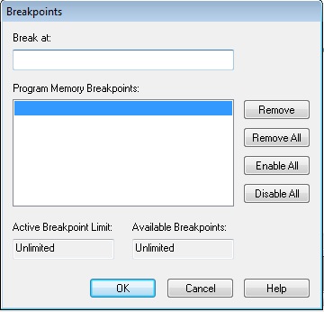 Inserendo un valore numerico nel campo “Break at:” e premendo il tasto Return, questo viene aggiunto alla lista “Program Memory Breakpoints:”. Premendo il tasto “OK” vengono creati i breakpoint agli indirizzi specificati. E’ possibile specificare anche un path realativo ad un file seguito da una virgola ed un valore numerico secondo il seguente formato “Path\File,NumeroRiga”.