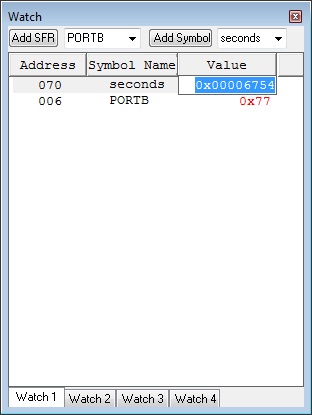 E’ possibile avere quattro tab per potere impostare diverse finestre per la visualizzazione delle variabili/registri di interesse. Cliccando sul simbolo di scroll presente ai lati dei button “Add SFR” e “Add Symbol” vengono visualizzate le variabili o registri che possono essere monitorati/modificati.