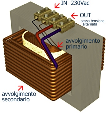 Al fine di ottenere la riduzione della tensione dai 230VAC della rete ai 6/12/24/36VAC che ci necessitano, dobbiamo servirci di un trasformatore